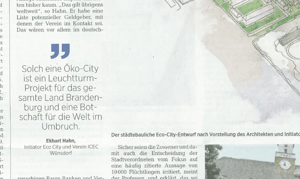 “Verwaltung lehnt Öko-Stadt weiterhin ab” Fred Hasselmann, Pressesprecher der Stadt Zossen bestätigt: “Die Verwaltung hält die Visionen des Vereins ICEC, dessen Vorsitzender Hahn ist, weiterhin für unrealistisch und nicht finanzierbar.” Den ganzen Artikel können sie hier einsehen: Online Weblink hier. Artikel als PDF hier: